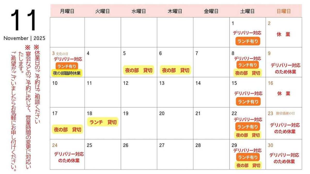 11月の営業案内です