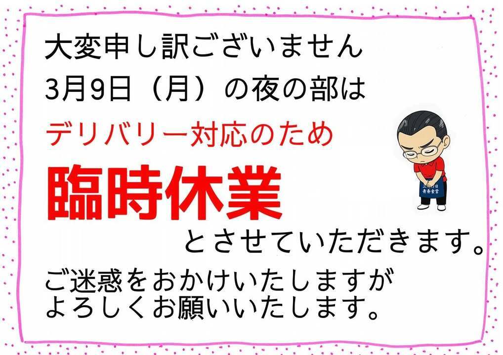 デリバリー対応のため臨時休業とさせていただきます。